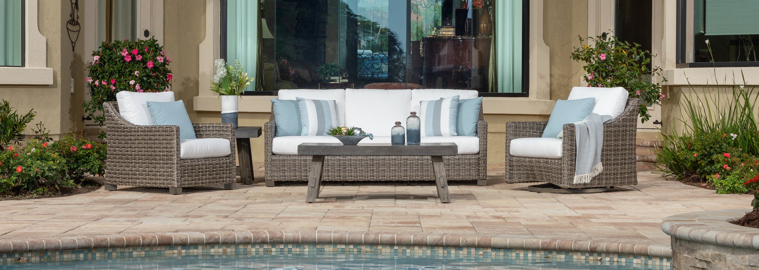 Discover elegant, weather-resistant furniture perfect for any outdoor space. Explore our expanding collection of stylish dining sets, sectionals, sofas, chairs, umbrellas, fire tables, and accessories.